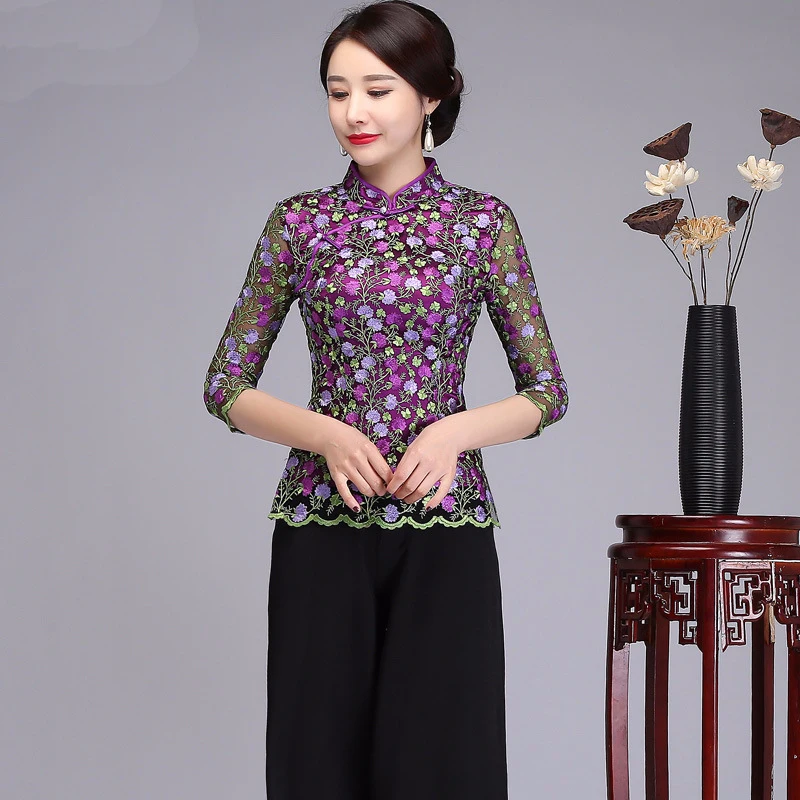 Cheap Noble Lace Mother Half Sleeve Clothes Chinese Vintage Mandarin Collar Shirt Top Elegant Women Flowe