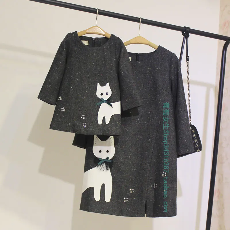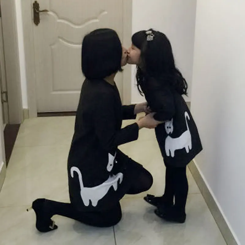 New Mother Daughter Dresses White Cat Dress Family Matching Outfits Mama and Kids Children Clothing Mot