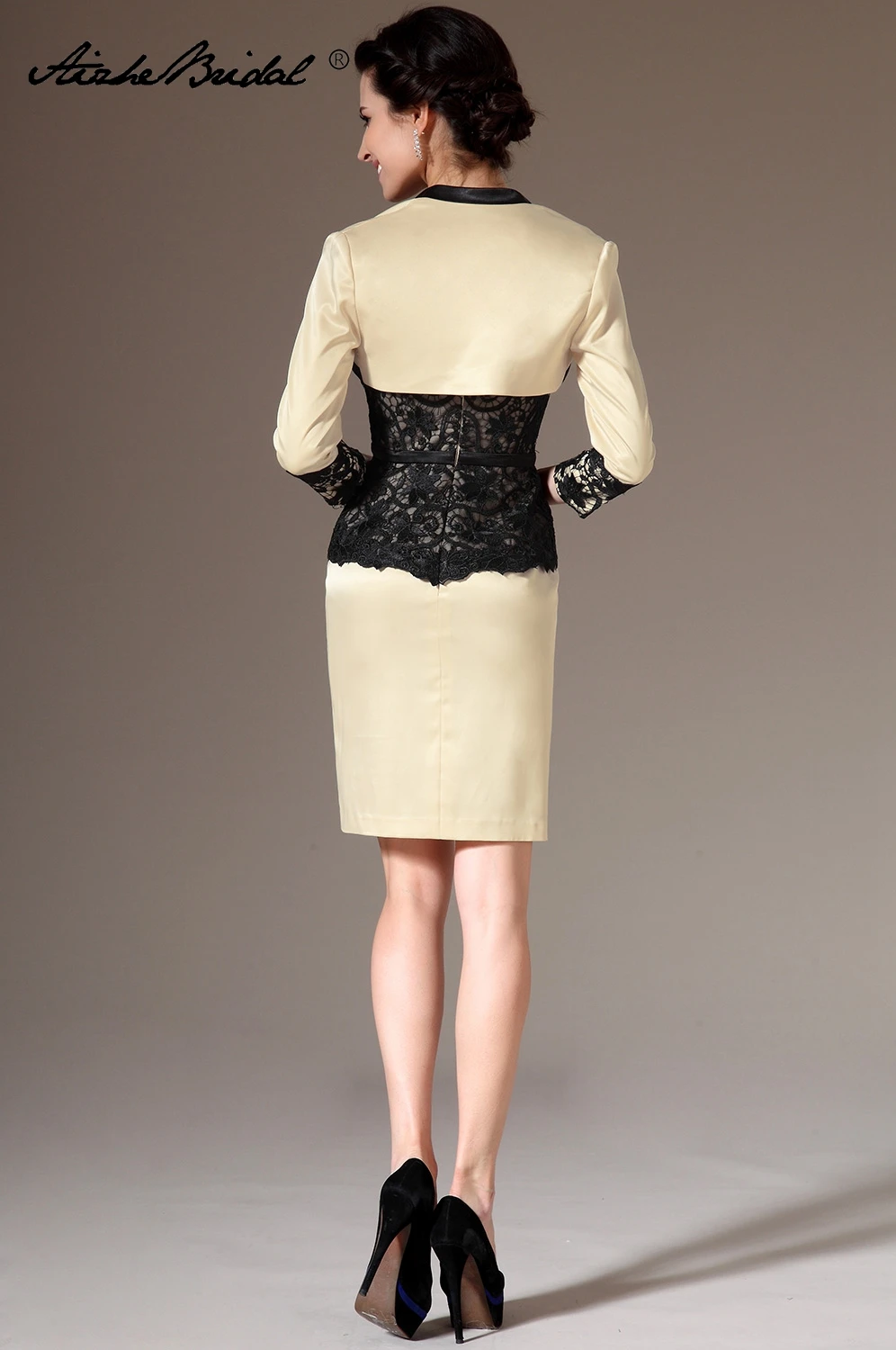 • Hot Product Champagne Satin Lace Appliques Knee-Length Sheath Mother of the bride dress Custom made
