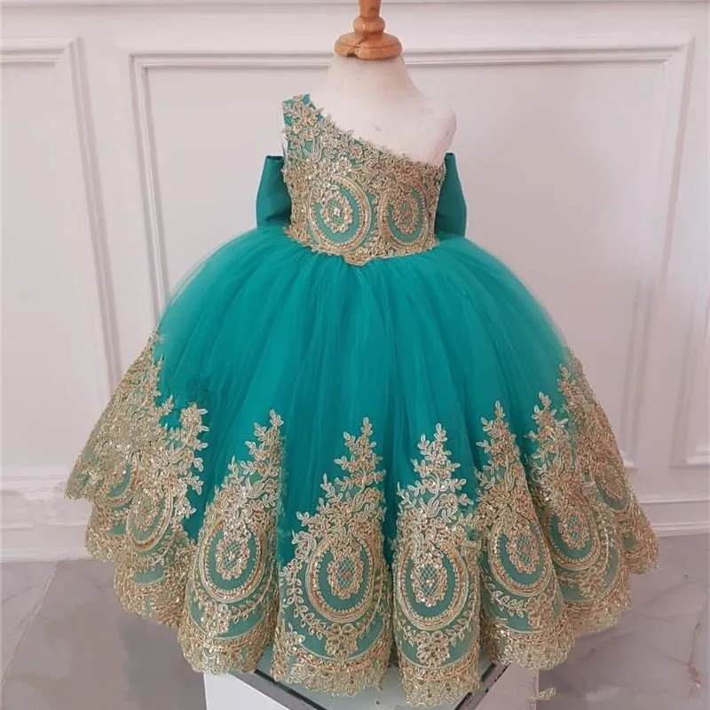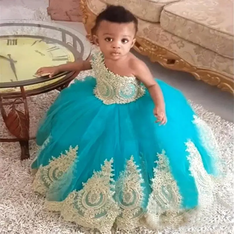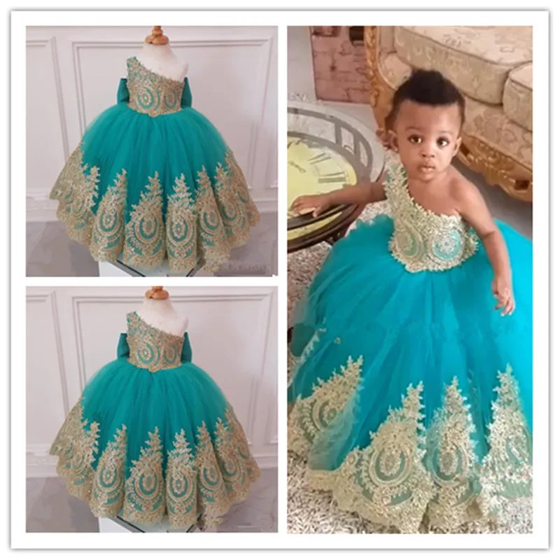 Special African Girls gold Flower Girls' Dresses Ball Gown One Shoulder Knot Bow Long Tulle Girls Birthday