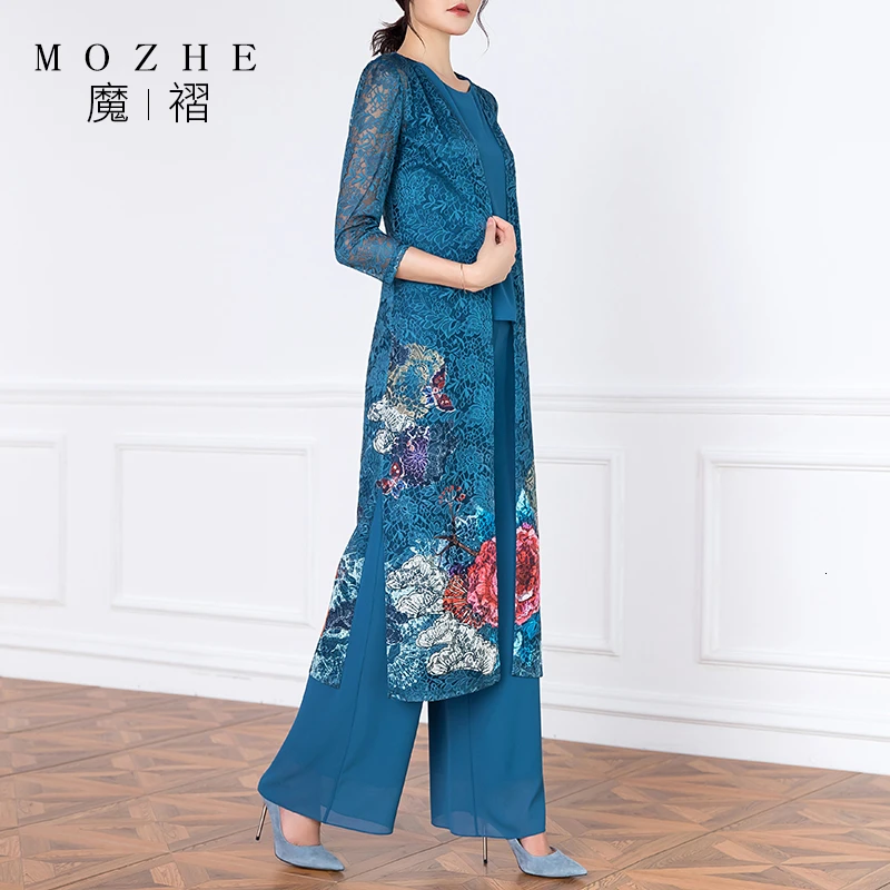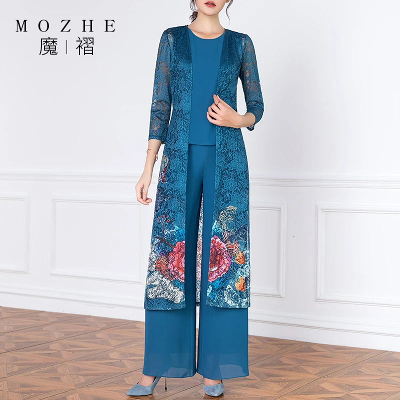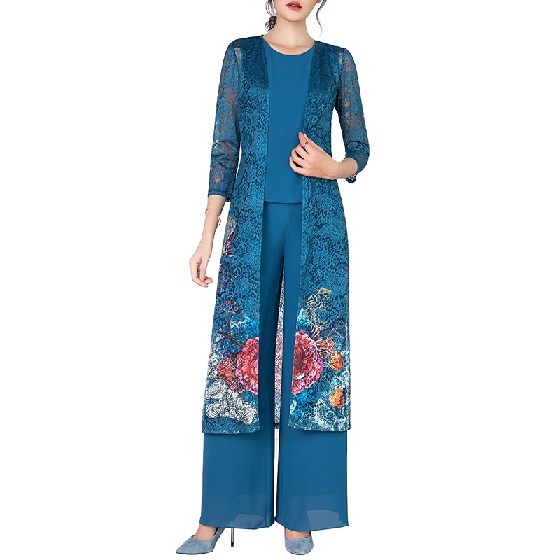 New Mother of The Bride Pant Suits Plus Size XXXL Elegant Wedding 3 Pieces Set Floral Lace Chiffon Wide
